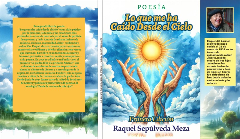 Su segundo libro de poesía “Lo que me ha caído desde el cielo” es un viaje poético por la memoria, la familia y las emociones más profundas de una vida marcada por el amor, la pérdida, la esperanza y la fe. A través de relatos íntimos de infancia, vínculos, maternidad, dolor, resiliencia y redención, Raquel abre su corazón para transformar experiencias cotidianas y heridas silenciosas en versos que iluminan. Este libro es un testimonio sincero y humano que invita a recordar, sentir y sanar junto a cada poema. En 2006 se adjudica un Fondart con el proyecto “La piedra toba y la princesa Amarai”, una colección de esculturas de rostros en piedra toba donadas al Museo de Linares y a otros lugares de la región. En 2017 obtiene un nuevo Fondart, esta vez para enseñar a niños de la comuna a trabajar la piedra toba. Desde junio de 2024 forma parte de la Red de Escritores de Linares y publica su primer libro de poemas, la antología “Desde la ventana de mis ojos”.